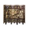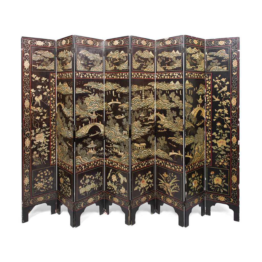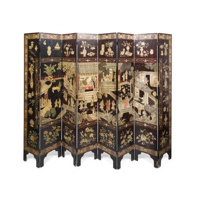 each fold decorated in polychrome with courtiers amongst pagoda and walled gardens, the reverse with flowering urns and auspicious items