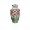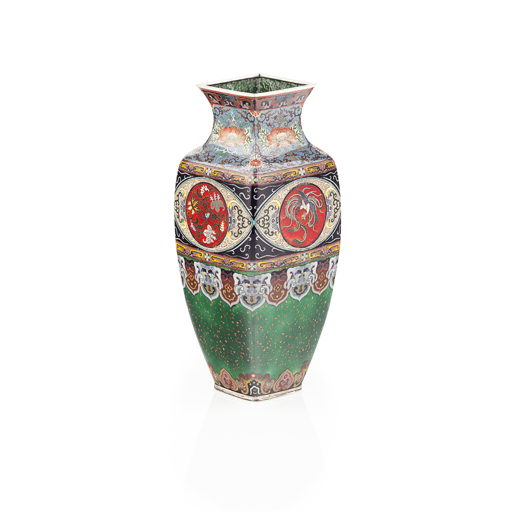 of squared form, the lower part of the body decorated in lacquer with gold leaves on green ground, the upper part of the body decorated in cloisonne with phoenix and flowers within red ground medallions and further floral and abstract motifs