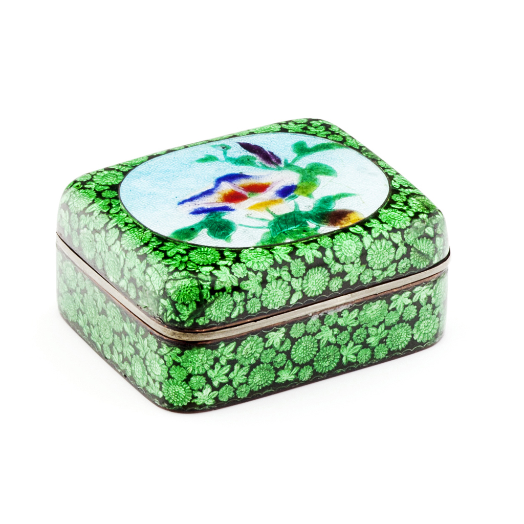 of rectangular form, decorated allover with green floral pattern, the cover with central reserve with flower