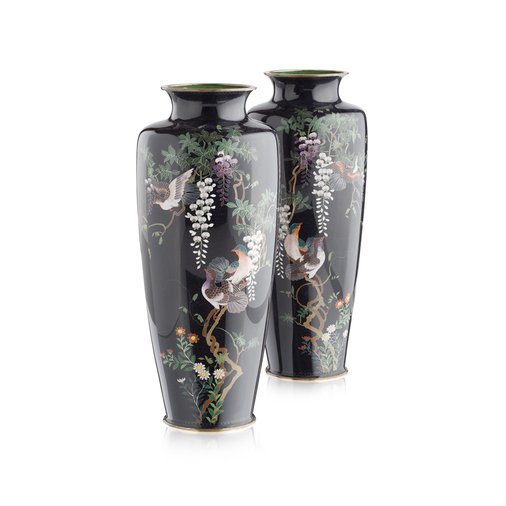 of baluster form with squared sides, decorated with birds perching on branches of wisteria on dark blue ground (2)