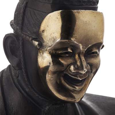 the bronze figure standing on one foot, with the opposite leg raised and bent at the knee, his arms wide open, dressed in a robe with large sleeves and a tall hat, wearing a gilt mask with a laughing expression and carrying an open gilt fan in his right hand, signed to the back, on square base