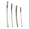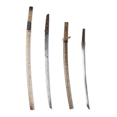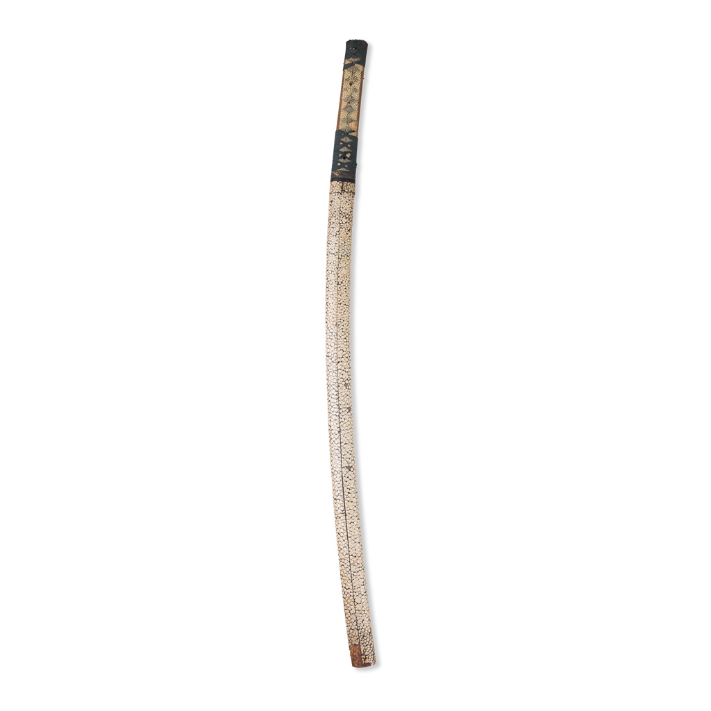 the wooden grip covered in ray skin and bound with silk cord (damaged beyond repair) mounted with gold carp on (fuchi and kashira) pommel, menuki and ferule (missing Tsuba) curved single edged blade of fine quality, in polished fish skin covered scabbard (missing base cap); together with a Wakatashi with pasteboard covered grip, damaged binding, (missing Tsuba) unmounted and with single edge blade of poor quality and condition in fine fish skin covered scabbard (2)