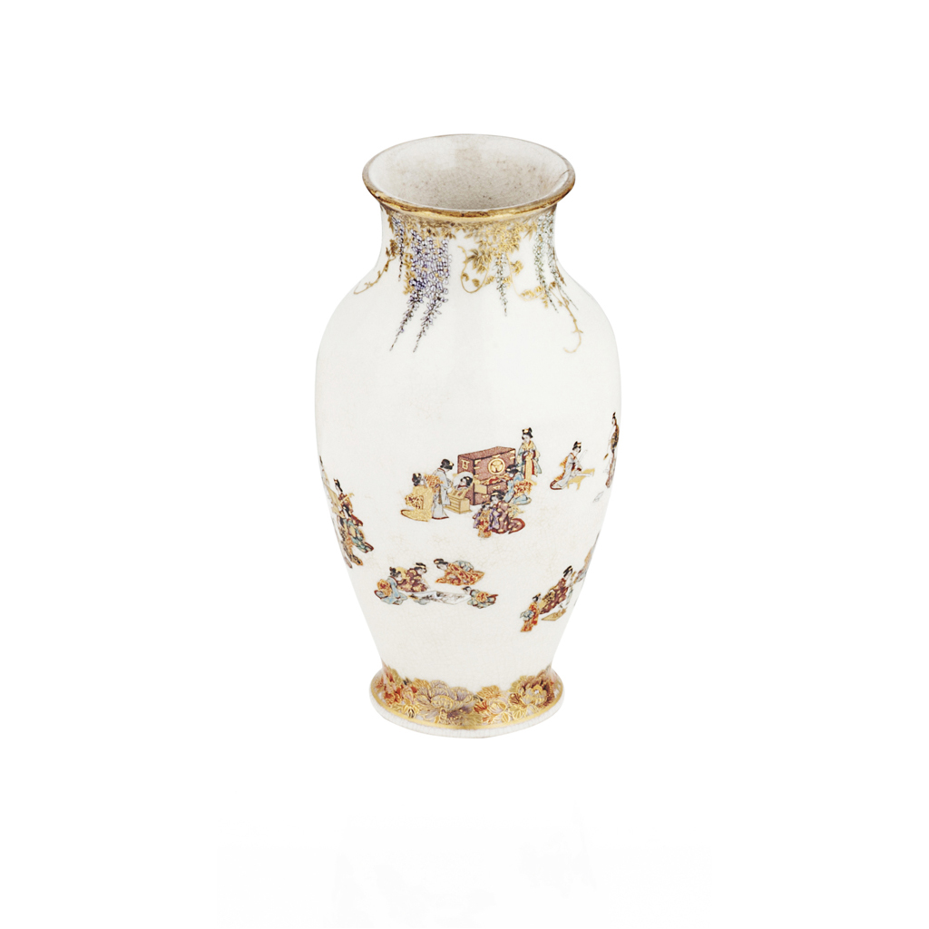 of ovoid form with a flaring neck, the body of plain design with a clear crackled glaze and ladies in various pursuits, including board games, painting, dressing, music, ikibana, embroidery, theatre, the neck and shoulder decorated with trailing wisteria, the foot circled by a flowerhead border, with gilt rim, signature on base
