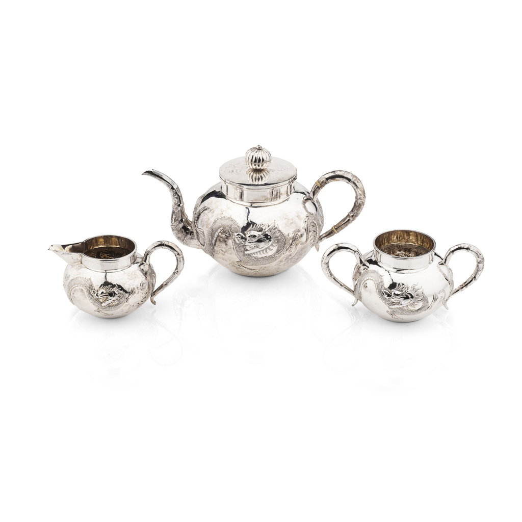 marked to base WC, 90, comprising teapot, twin handled sugar bowl and milk jug, each of compressed spherical form with chased trailing dragons around the body and bamboo formed handled and spout, contained within original wooden carry case with fitted interior and handles (3)