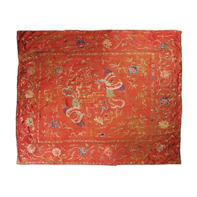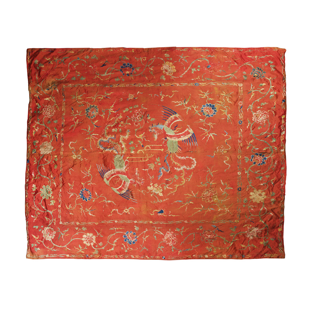 embroidered in polychrome threads with two central phoenix amongst peonies and scrolling leafy branches