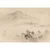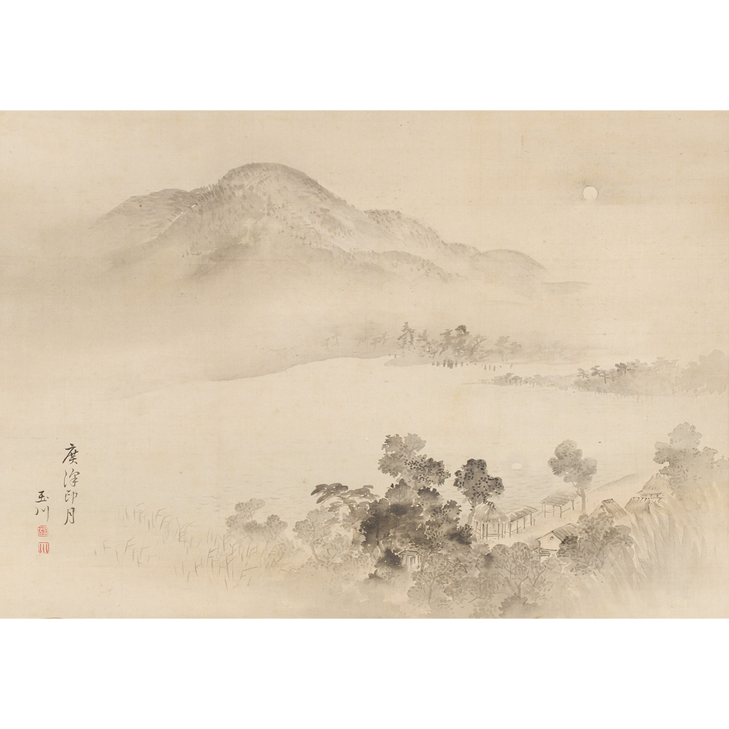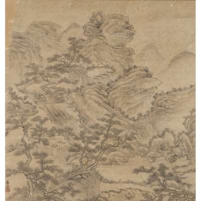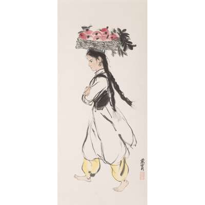 two hanging scrolls, one depicting a landscape, the other after Huang Zhou depicting a lady with a basket of fruit on her head; together with a JAPANESE HANGING SCROLL depicting a mountain and river scene (3)