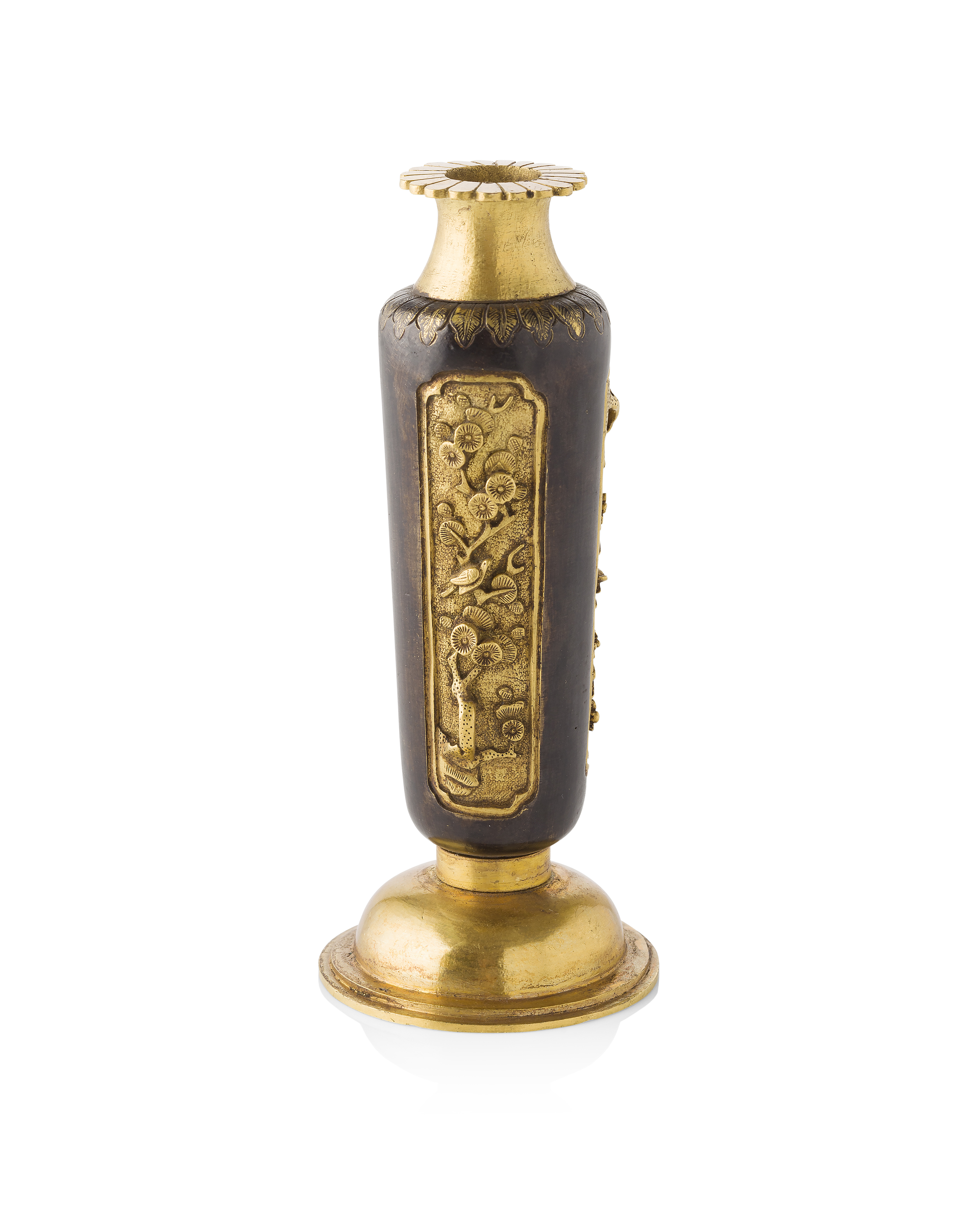 of tapered circular form, the sides with four gilt reserves decorated in relief with birds perched on branches of plum blossoms and pine trees and chrysanthemums, the flared neck ending in a gilt chrysanthemum-shaped mouth, on a gilt domed foot