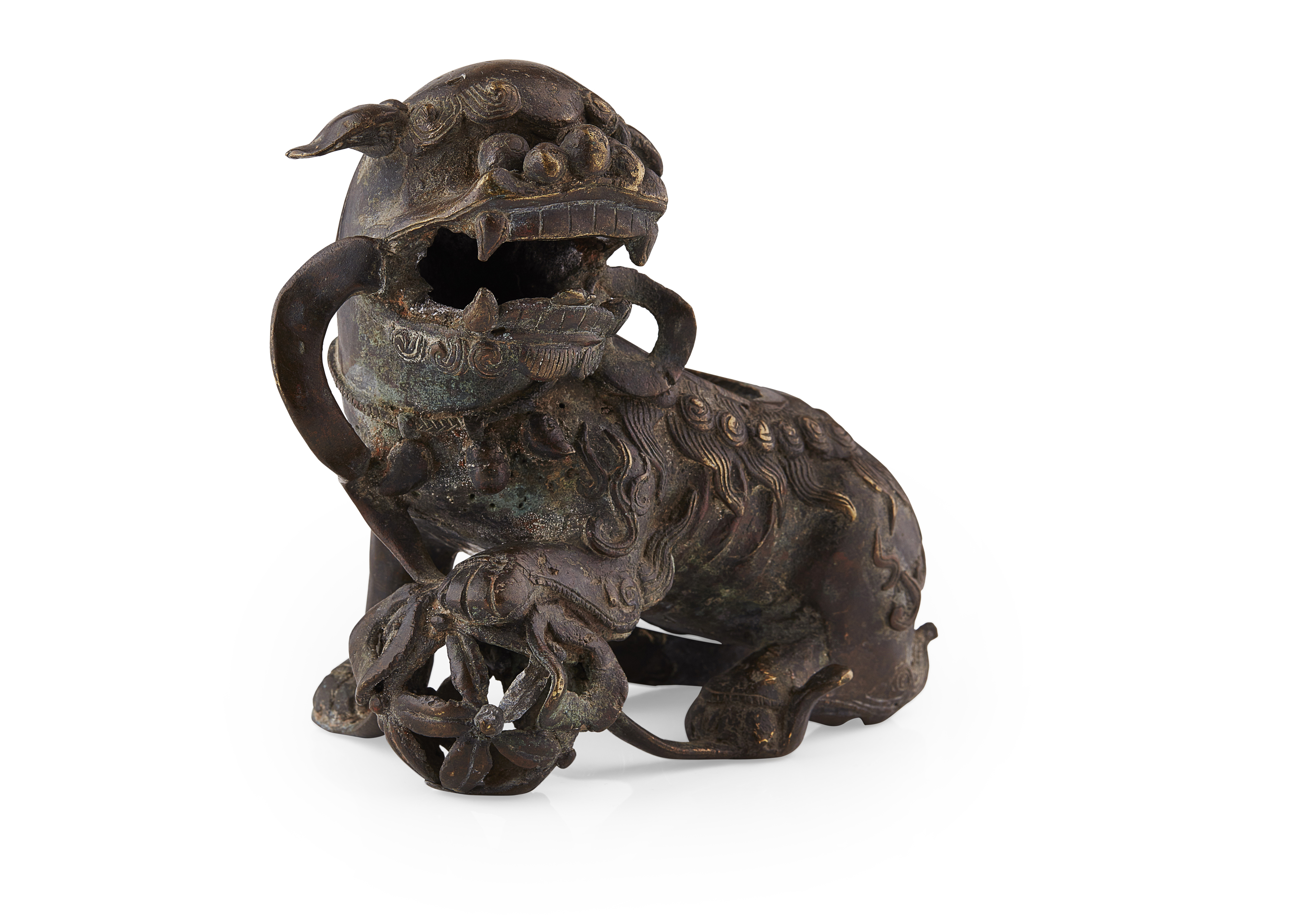 finely cast with its head turned, the mouth fiercely open and resting its left forepaw on a brocade ball