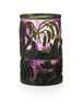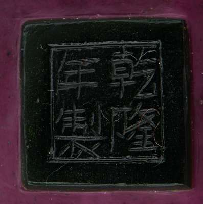 of cylindrical form, decorated on a purple-tinted ground with two scholars in a boat drifting across a lotus pond below willow trees, apocryphal Qianlong mark to the base
