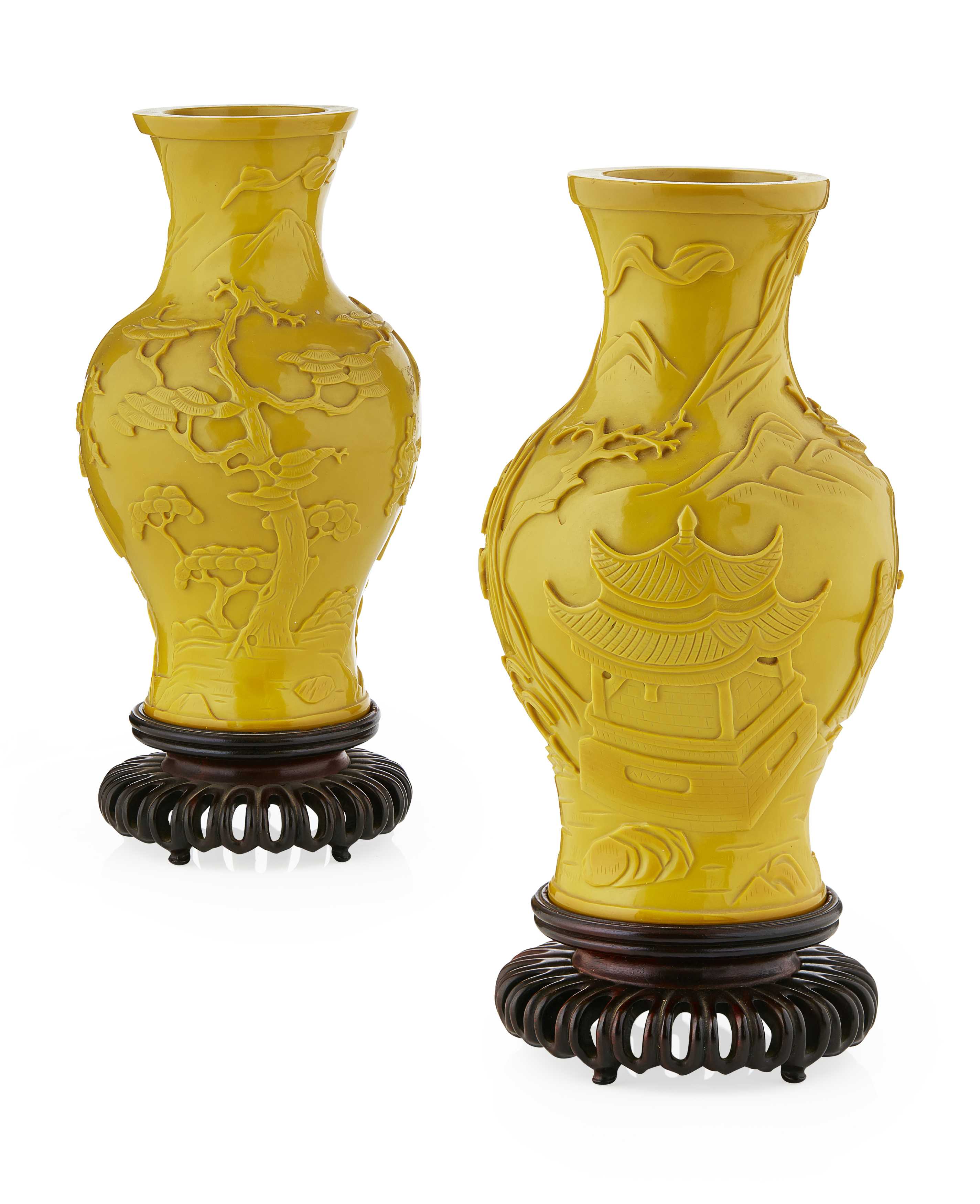 each carved to the exterior with a scholar and his young attendant in a landscape with mountains, pine and pavilion, the glass of an even opaque yellow tone (2)