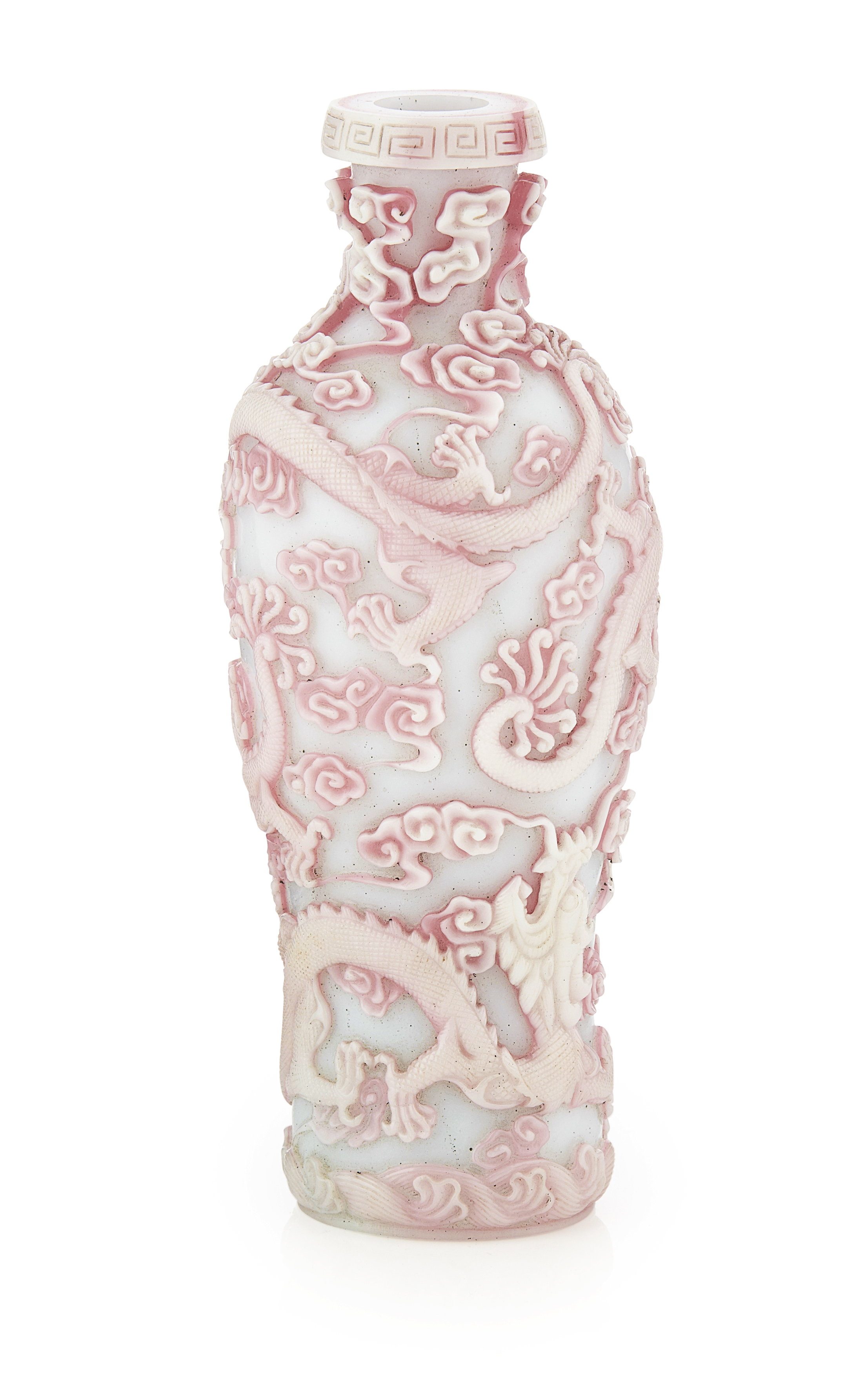 of bottle form, the pink overlay decoration depicting dragons chasing the flaming pearl amongst ruyi clouds, the rim with key fret border