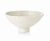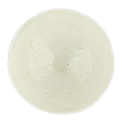 the deep sides flaring towards the lobed rim and resting on a straight tall foot, moulded to the interior with stylised flowers, the body covered on the exterior and interior in a creamy-white glaze