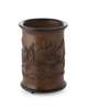 of cylindrical form and raised on three short feet, carved around the exterior with the 'Three Stars' Fu, Lu and Shou travelling in the air above clouds and across a mountainous landscape with pine trees