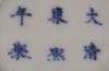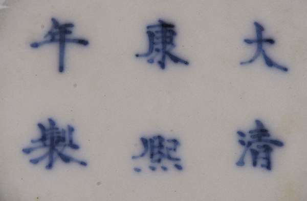 carved to the exterior with peony scrolls with large blossoms and dense scrolling leaves below a key-fret border, six character Kangxi mark to the underside in underglaze blue