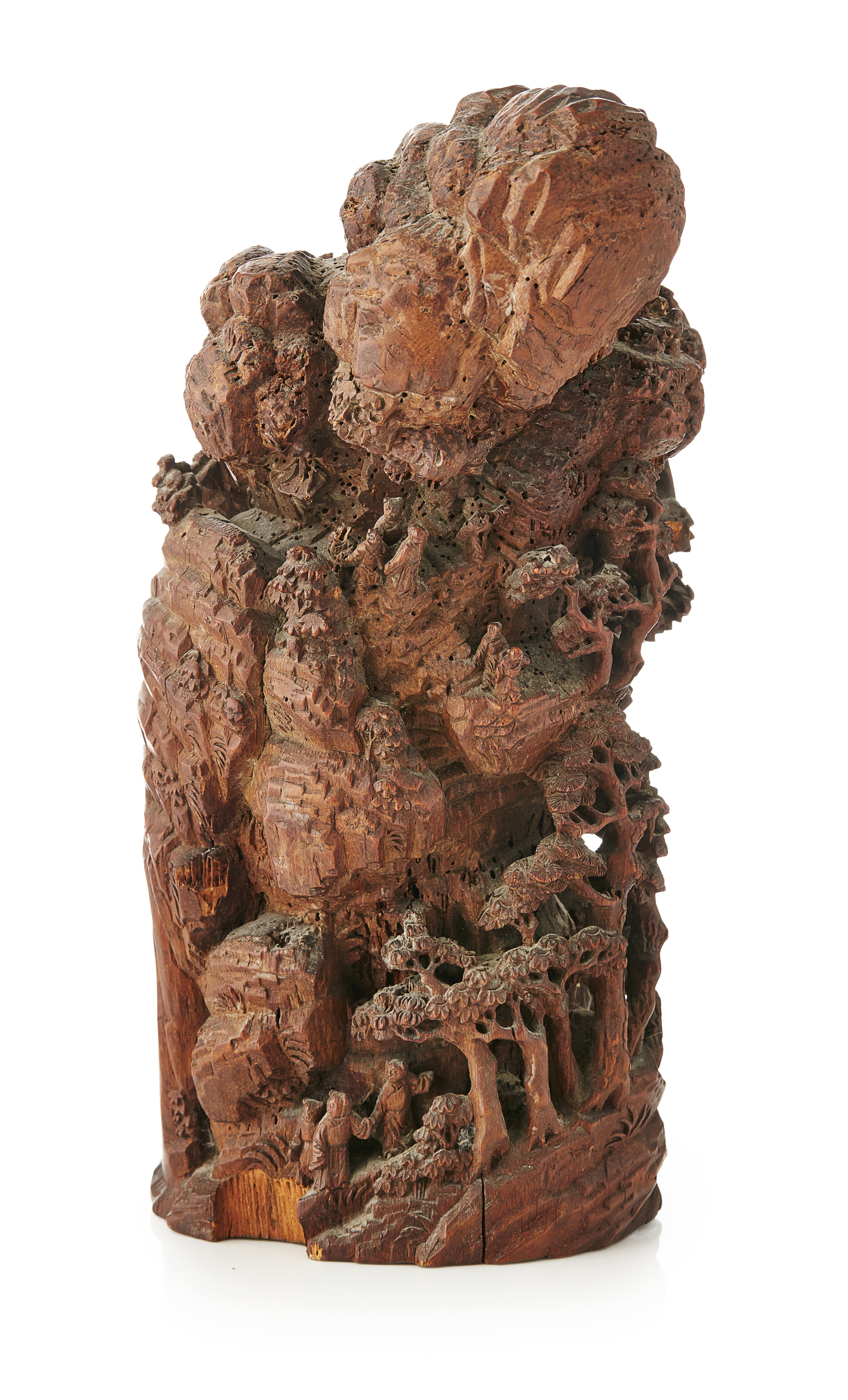 finely carved in high relief and undercut around the sides to depict a gathering of scholars in a mountain landscape with gnarled pine and craggy rocks, some engaged in a calligraphy session accompanied by young attendants, above them further scholars and entourage arriving along a mountain pass