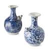 both of globular form with flared rim, one with a decoration of peonies amongst scrolling branches, the other with phoenix and stylised lotus scroll decoration and with metal spout and metal collar at the rim (2)