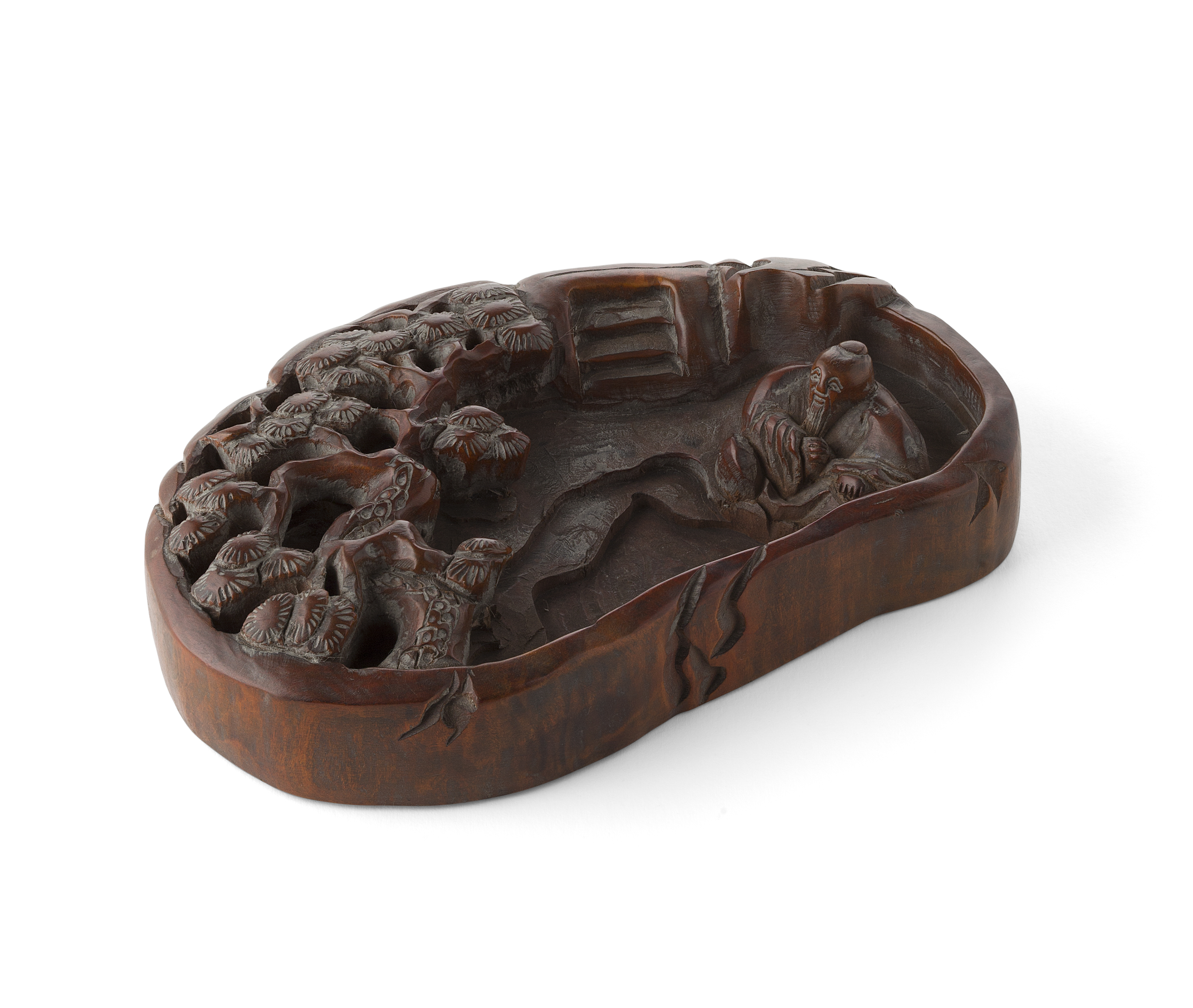 carved in the form of a rock formation, with three steps leading into a lower level where an old man sits facing a pine tree
