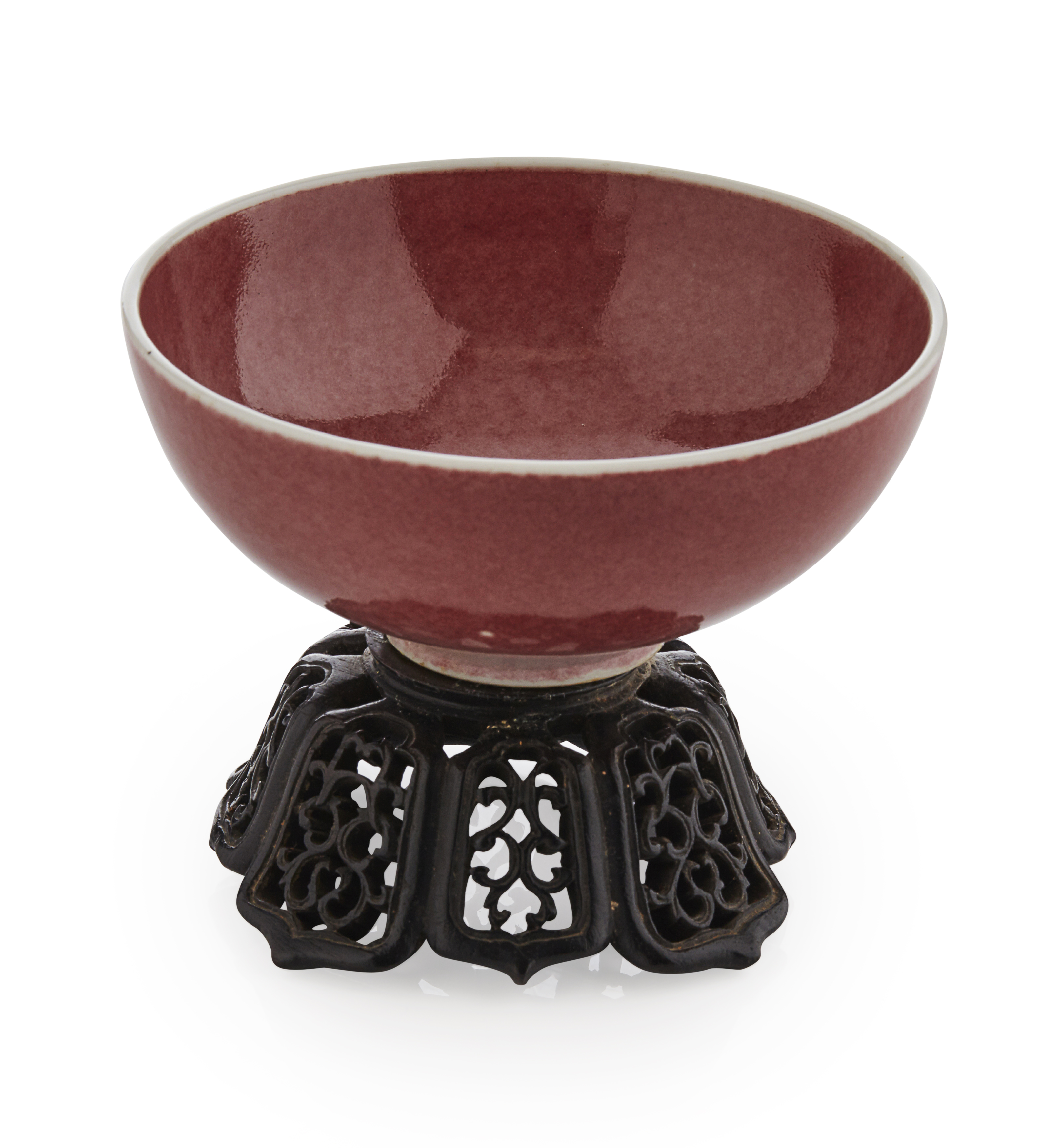 covered in a soft peachbloom glaze falling short of the rim, six-character apocryphal Kangxi mark to the base in underglaze blue, with pierced wood stand