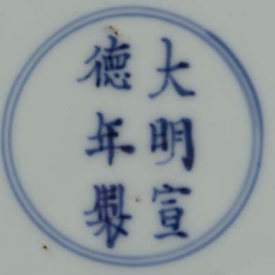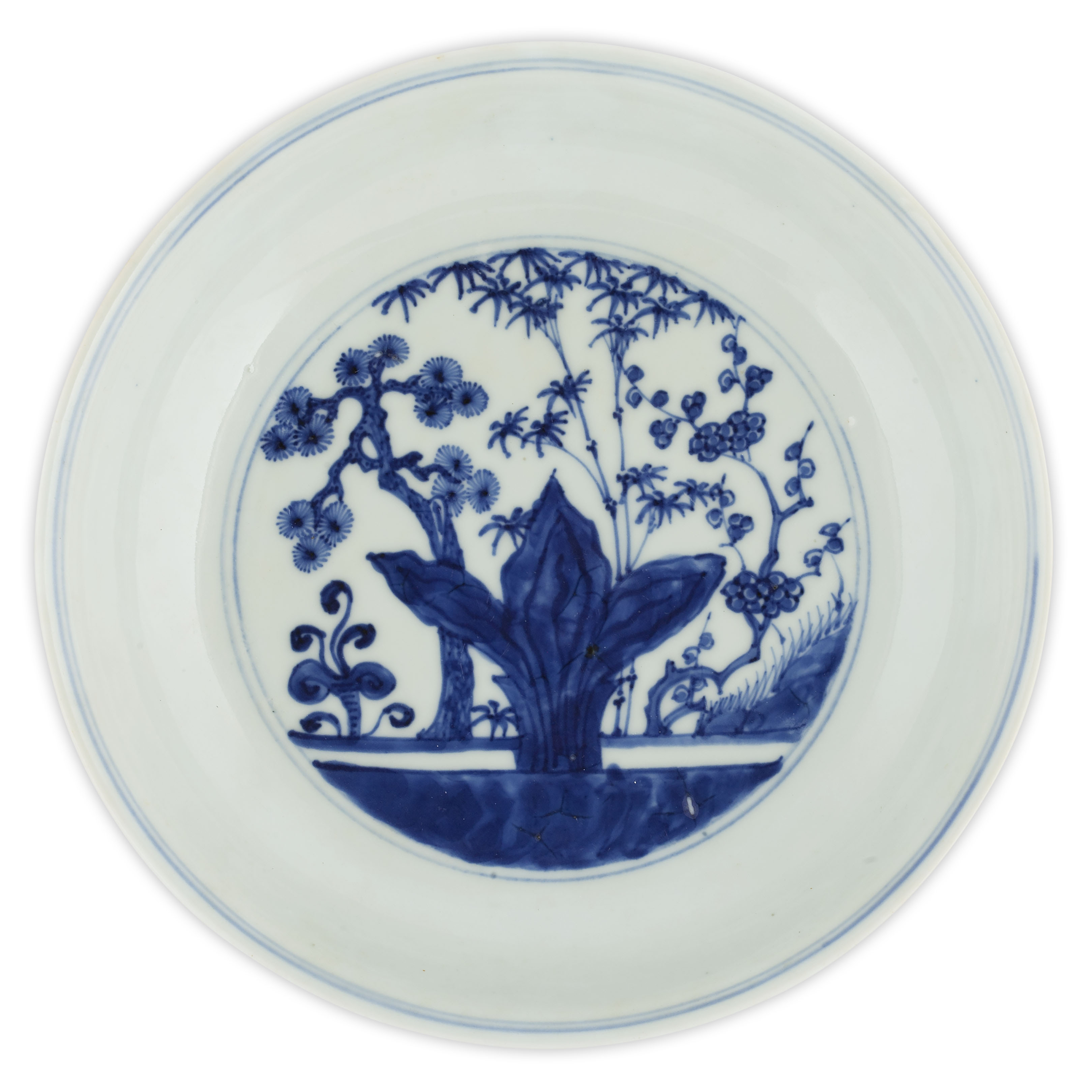 one decorated in the interior with a scholar-official playing Qin in a pavilion while two ladies are engaged in a conversation in the garden, the other two each decorated with various flowers and plants including prunus, bamboo and musa, the bases bearing a provincial kiln mark or an apocryphal Xuande mark (3)