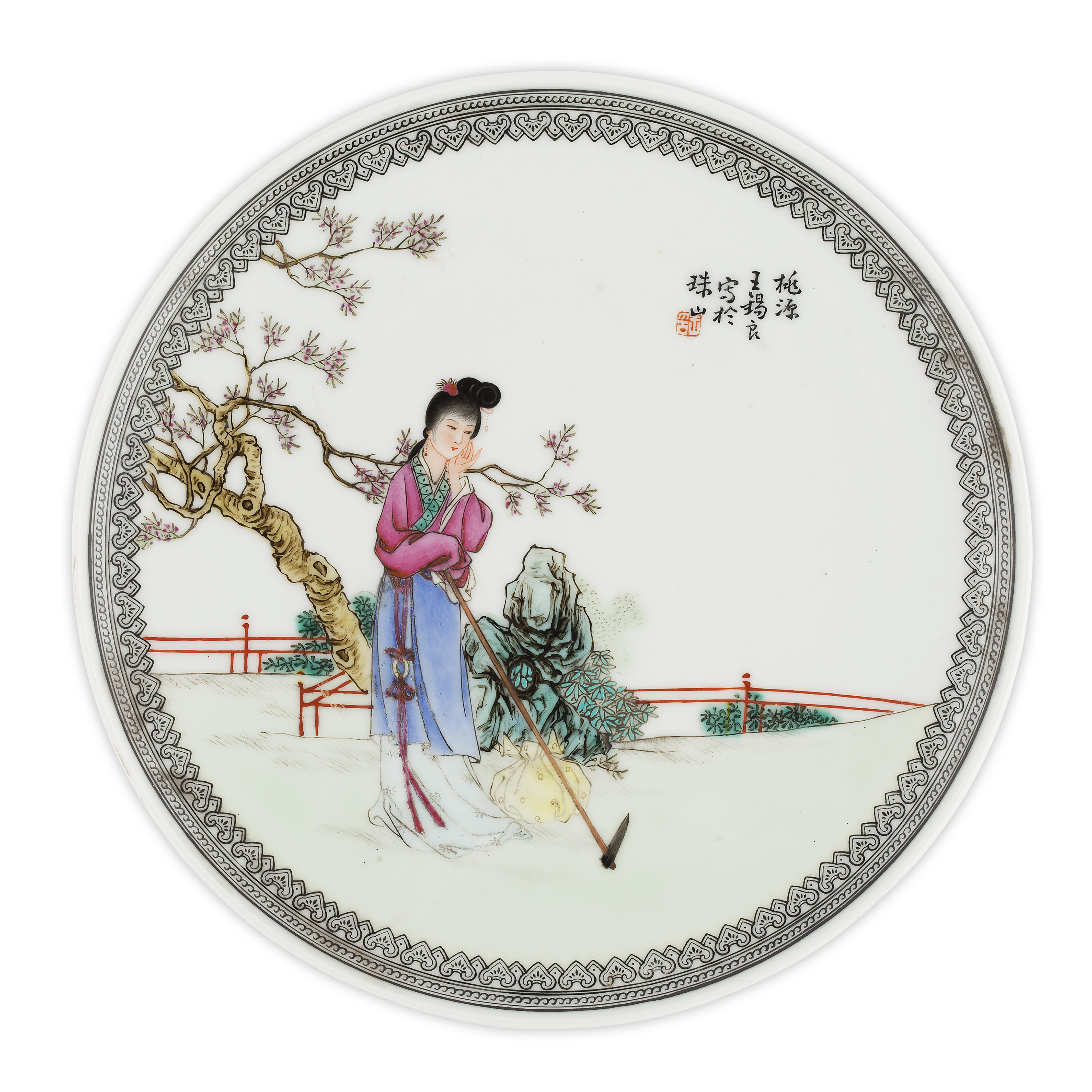 painted with a lady under a blooming prunus tree in a garden, her right hand holding a hoe, encircled by a ruyi-head band, inscribed, signed and with one seal of the artist