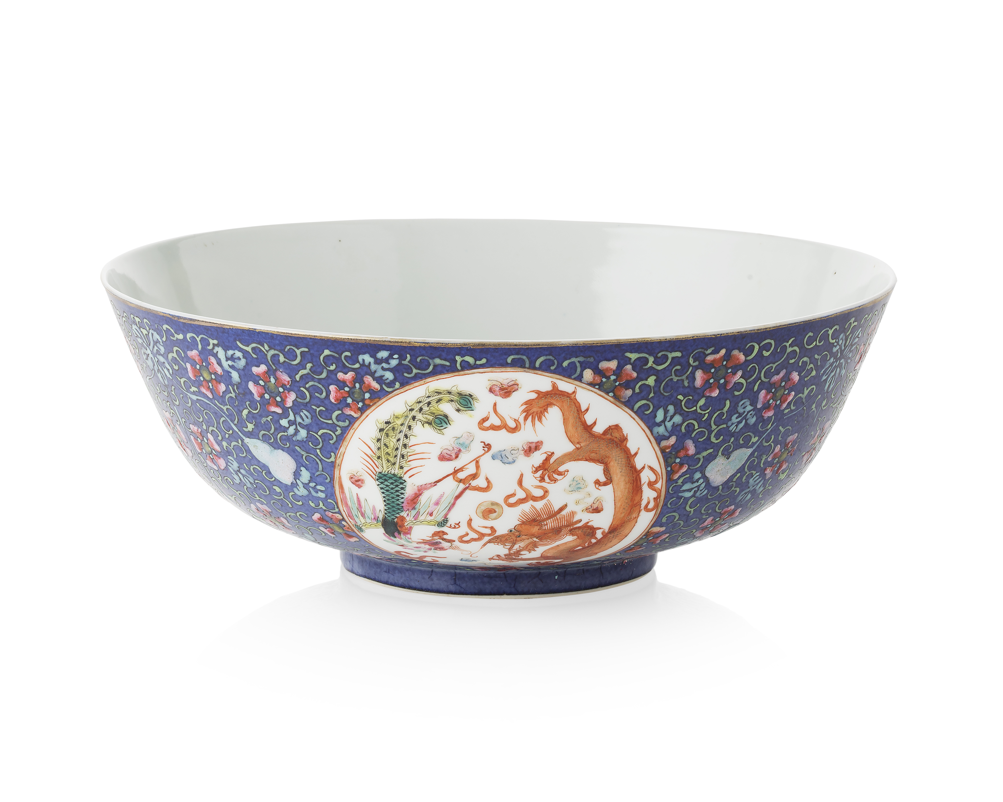 LARGE BLUE-GROUND FAMILLE ROSE BOWL