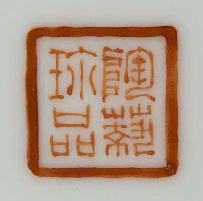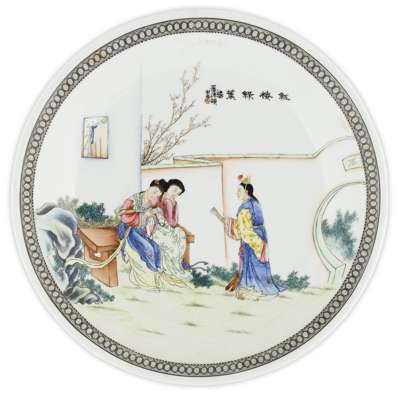 one decorated with Jiao Baoyu and Lin Daiyu, the two main characters of the novel Dream of the Red Chamber, four-character apocryphal Qianlong mark to the base; the other painted with two ladies playing Go in a garden accompanied by their attendants (2)
