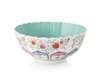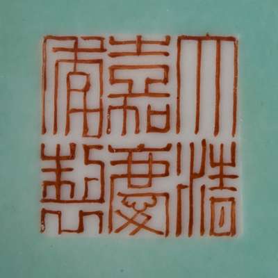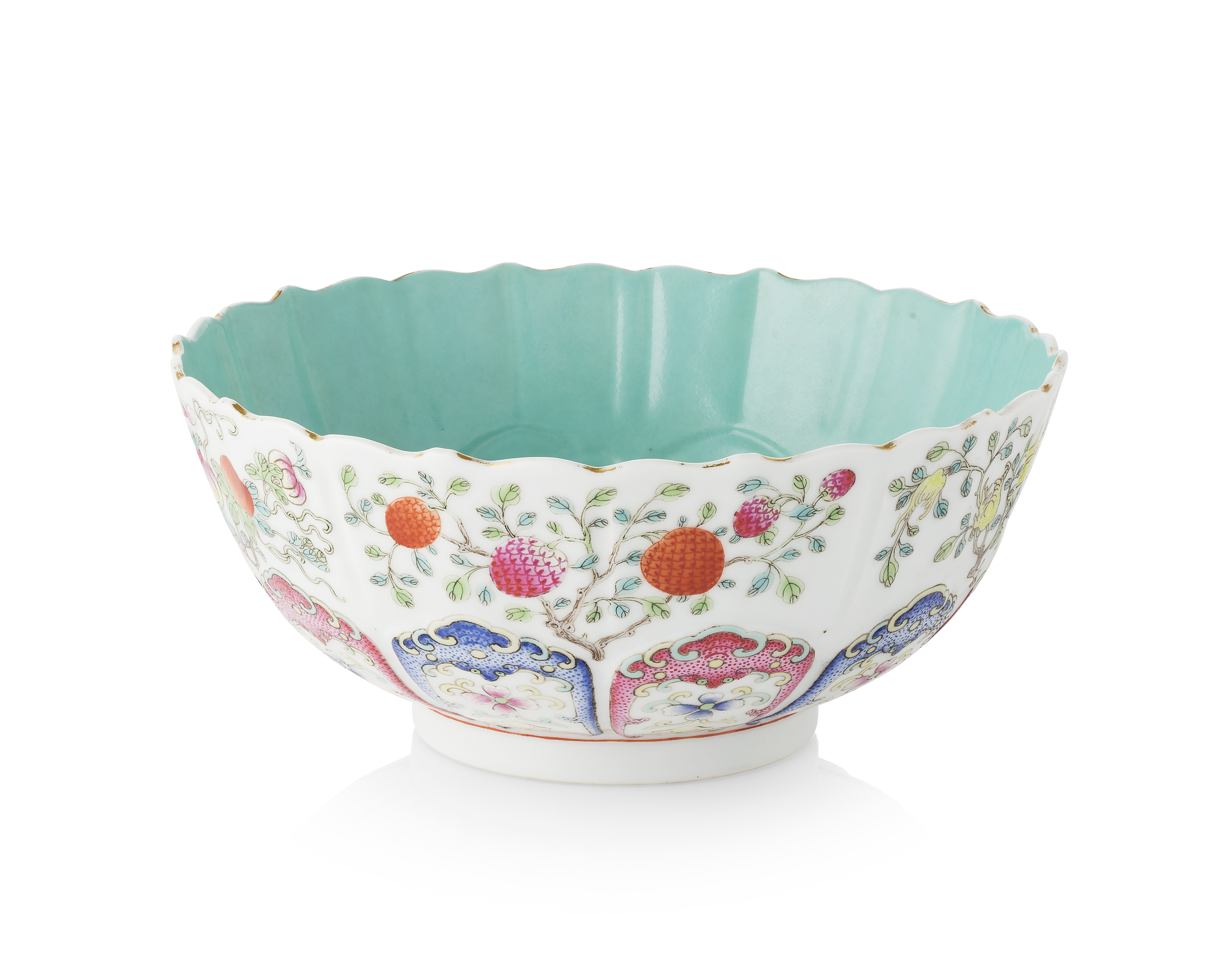 potted with rounded sides rising from a short base with floriform rim, the exterior enamelled with ten raised petal panels containing flowers in alternating colours below peaches, pomegranates and lychees borne on leafy branches, the interior covered in a turquoise glaze, six-character seal mark to the base in iron red