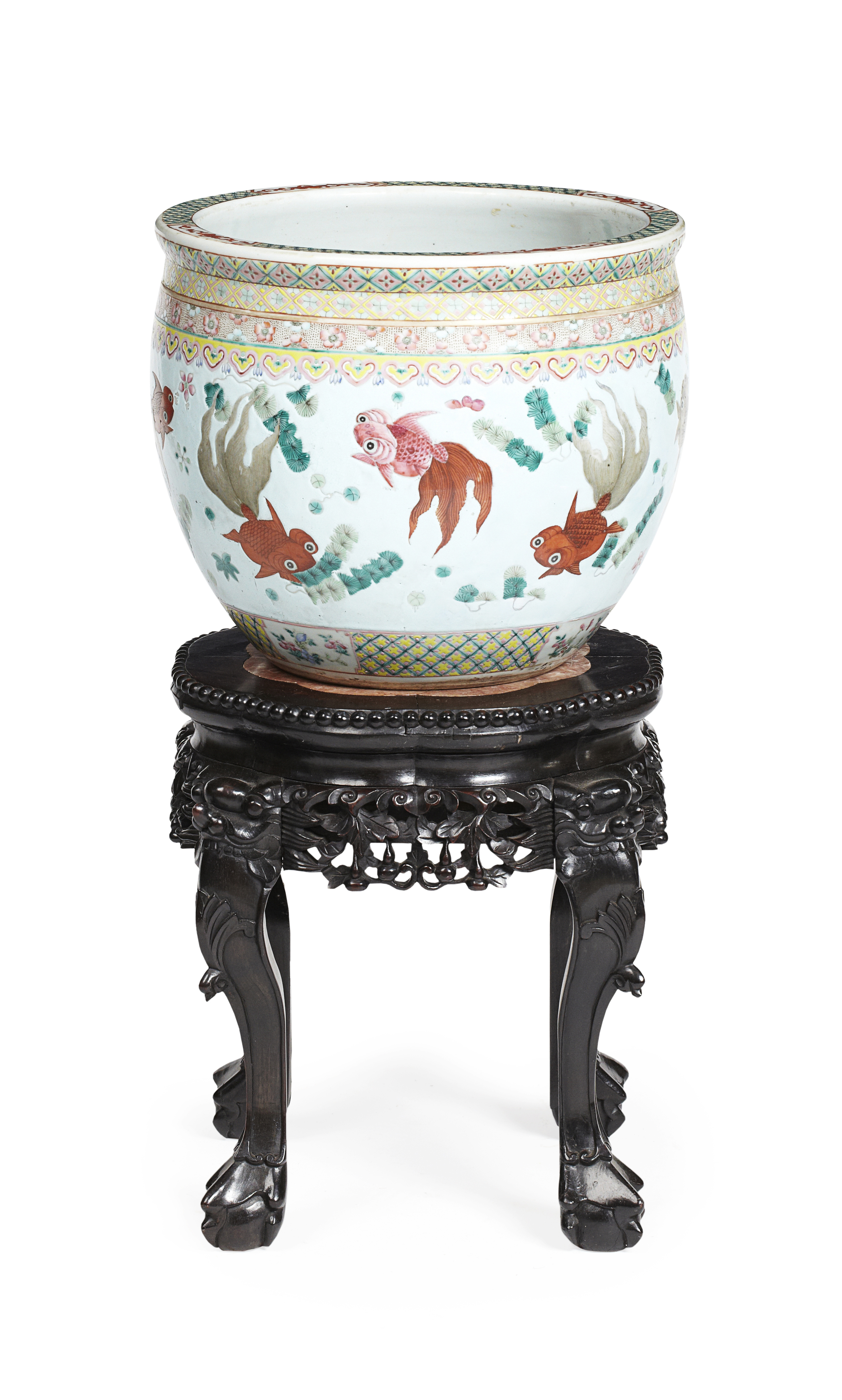 FAMILLE ROSE FISH BOWL AND MARBLE TOP STAND