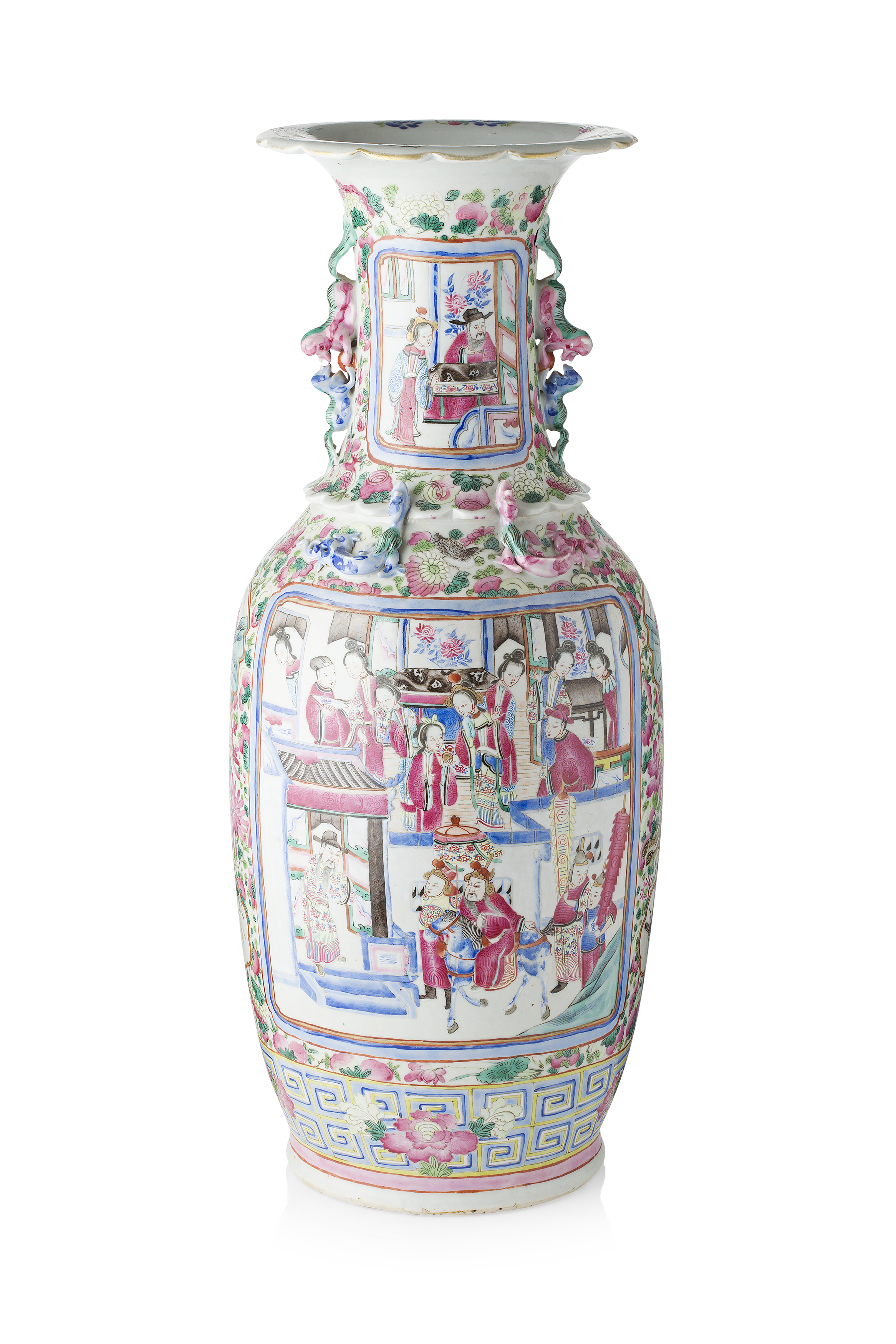 of baluster form, the body decorated with phoenix, peonies and peaches above fret decoration, the reserves depicting the arrival of a dignitary to the city wall and palace, with Buddhist lion handles and chilong resting on the shoulders