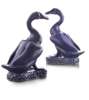 the large animals realistically modelled in a crouching position, the necks bent and heads facing forwards, with detailed feathers painted on the wings and body, resting on dappled rock surface (2)