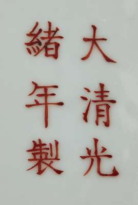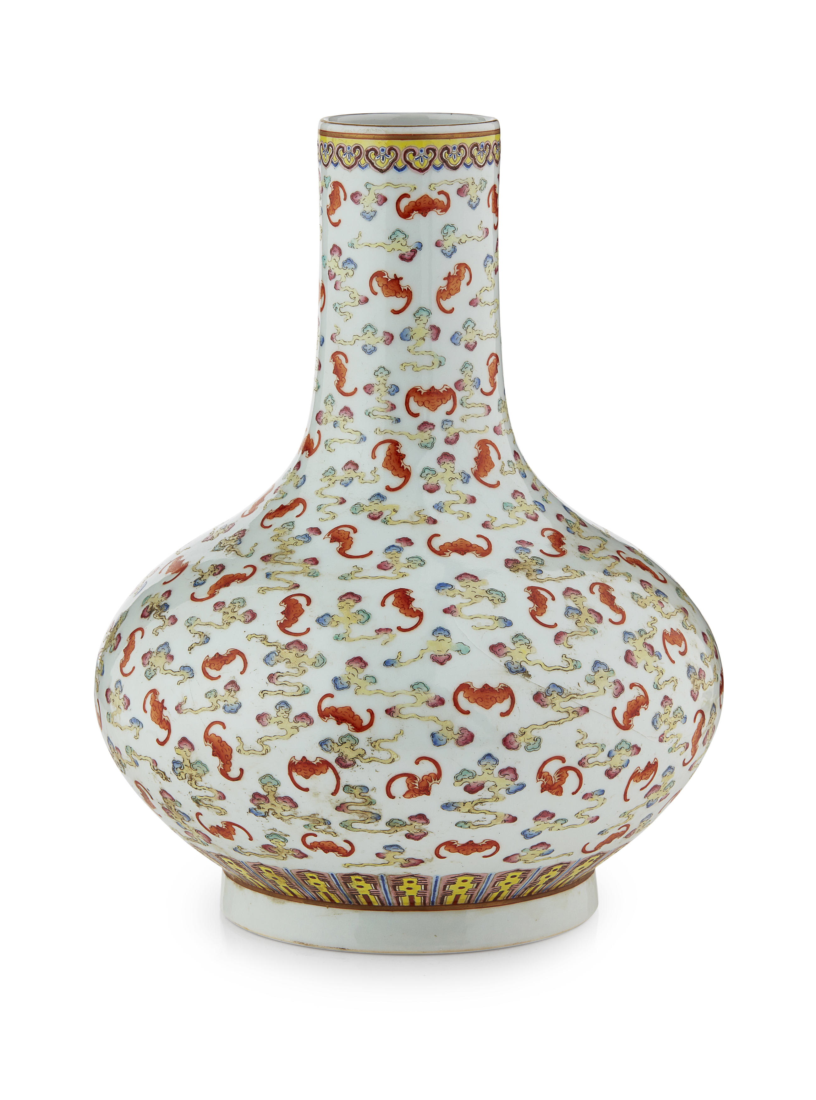potted with compressed bombé body and tall neck, enamelled with iron-red bats and colourful clouds between a band of ruyi-head at the mouth and floral lappets at the foot, six-character Guangxu mark to the base