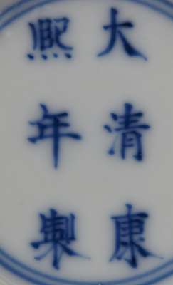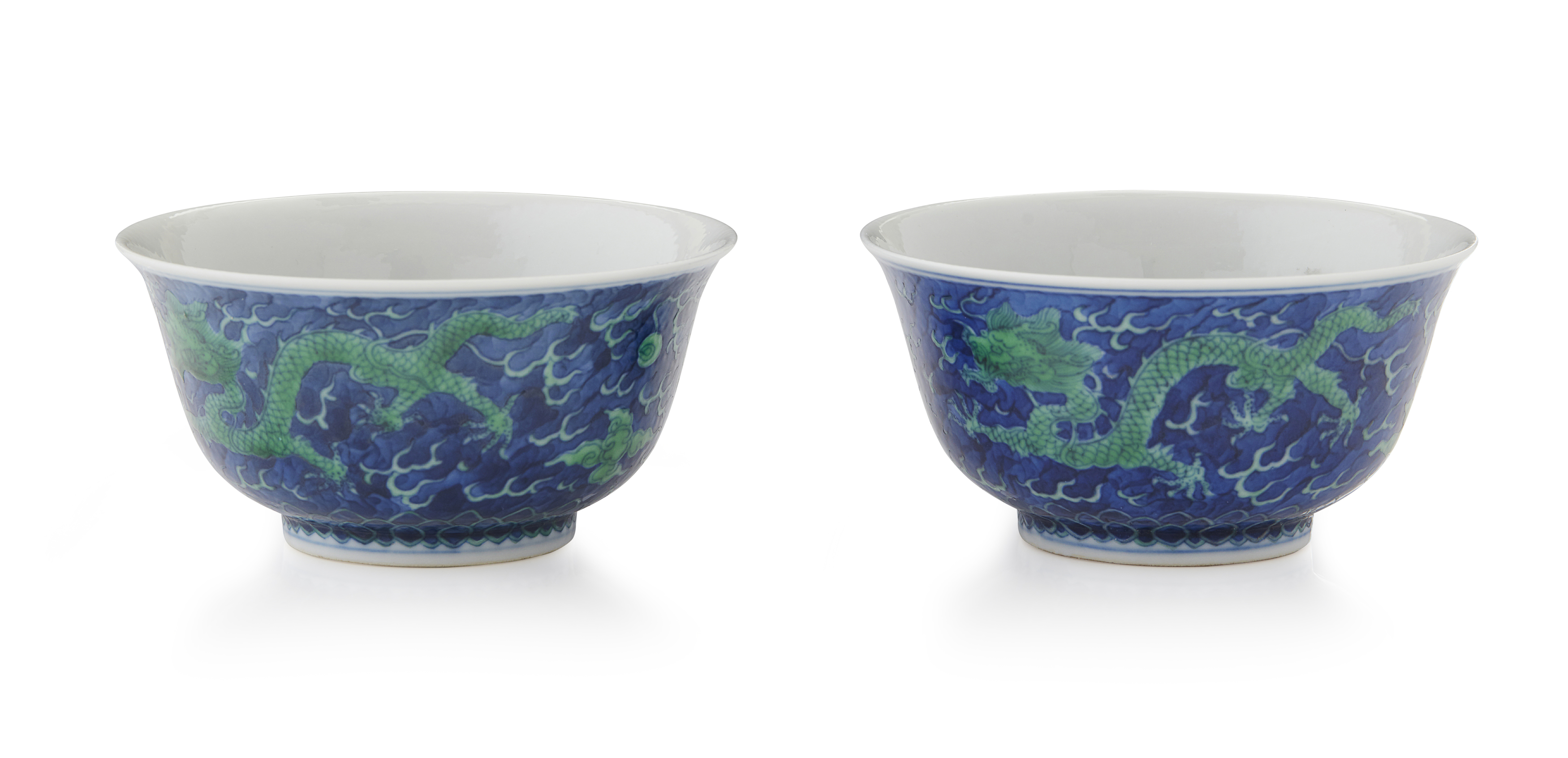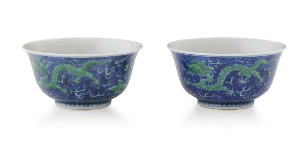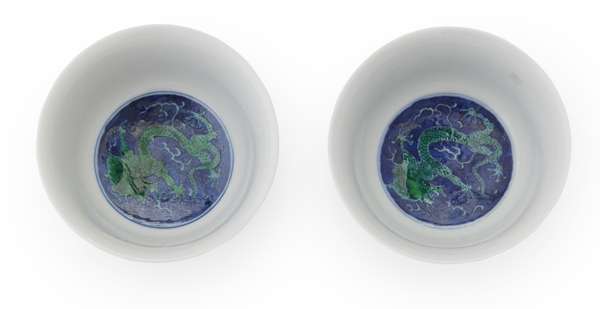 decorated with green enamelled dragons chasing the flaming pearl on an underglaze blue ground, the interior similarly decorated, the base with six-character Kangxi mark in underglaze blue within double ring (2)