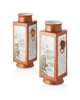 the tall square-sectioned body raised on a splayed foot and rising to a flaring mouth, applied with two elephant head shaped handles, the front and the back elaborately painted with a landscape, the sides inscribed with a poem, all against an iron-red ground with floral scrolls, apocryphal Daoguang mark to the base (2)
