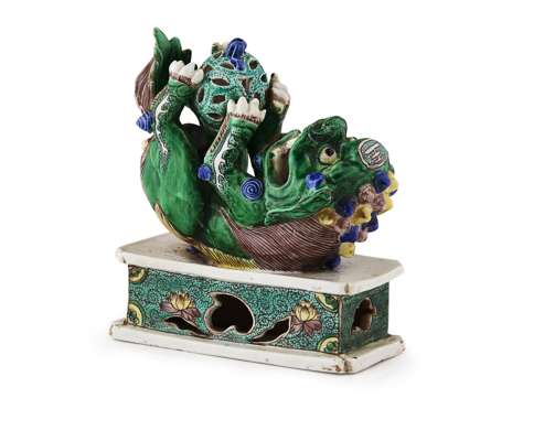 lying on its back and playing with the brocade ball in between its upturned legs, with ferocious facial expression, the body enamelled in vivid green and the mane in yellow and greyish-aubergine