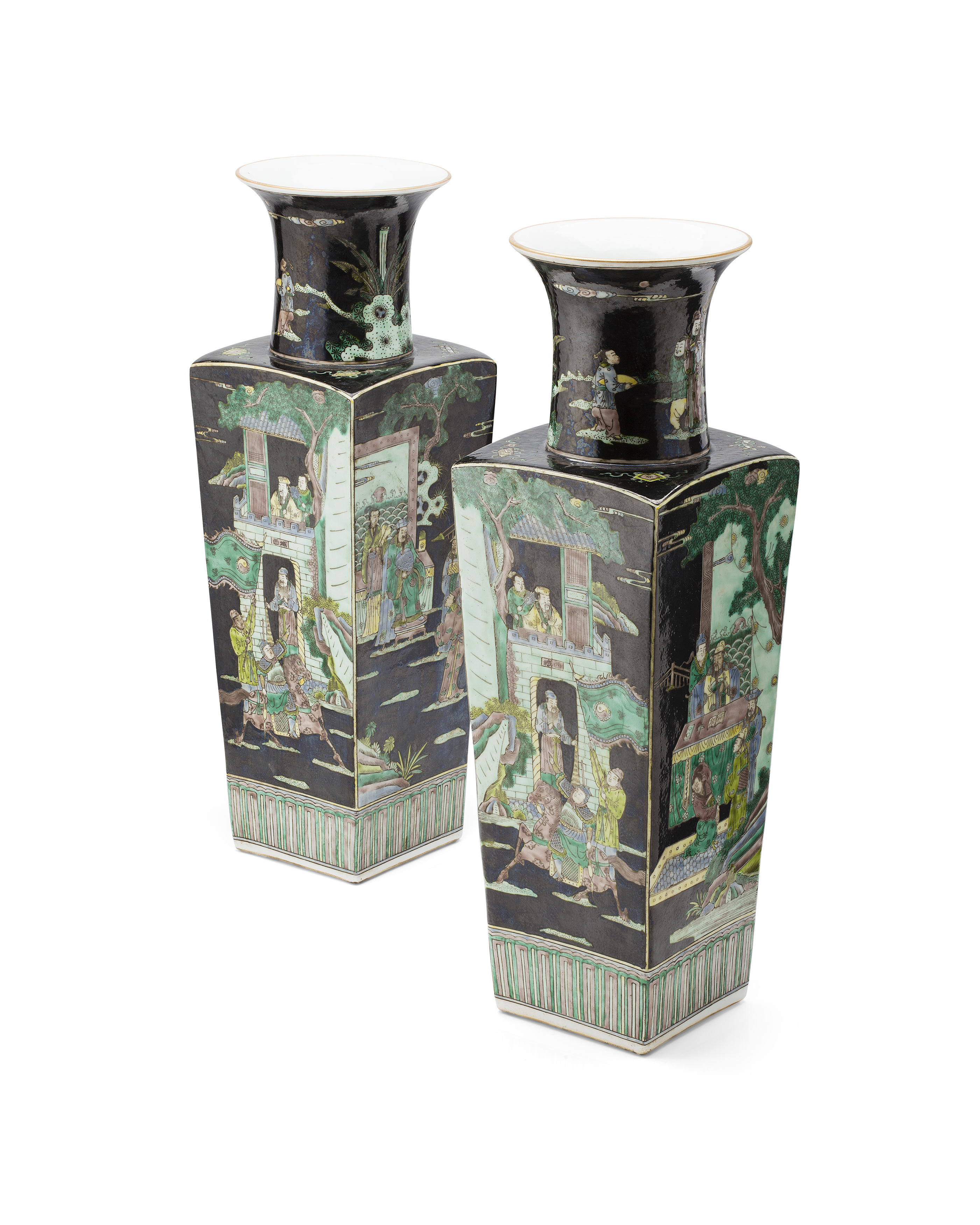 with a circular sectioned trumpet neck and elongated body of square section, the walls painted in green, yellow and manganese with scenes from the novel 'The Water Margin' centred on the character Zhuge Liang, six-character apocryphal mark on a square recess to the base (2)