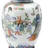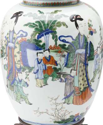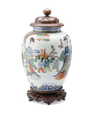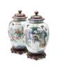 decorated in polychrome enamels and underglaze blue, depicting a scene of ladies playing with children in a terraced gardens, all within spearhead and diaper borders, with carved hardwood covers and stands (2)