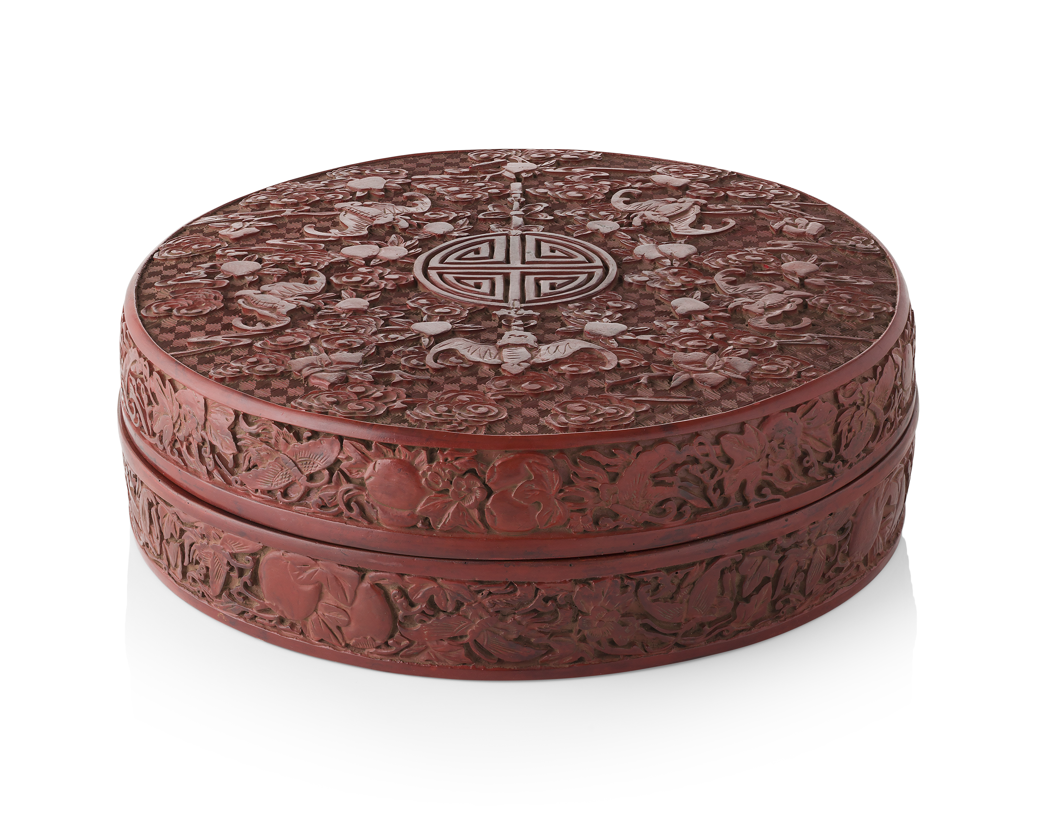 the cover crisply carved with a central shou medallion surrounded by five bats flying amongst lingzhi-shaped clouds, all reserved on a dense leiwen ground, the rounded sides of the cover and the box decorated with fruiting and blooming sprays, the base incised with an apocryphal Qianlong mark