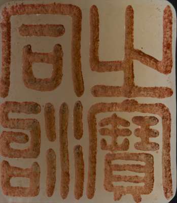 of square section and surmounted by a coiling dragon finial, the base carved with four characters in seal script reading 'Tong Zhi Zhi Bao'