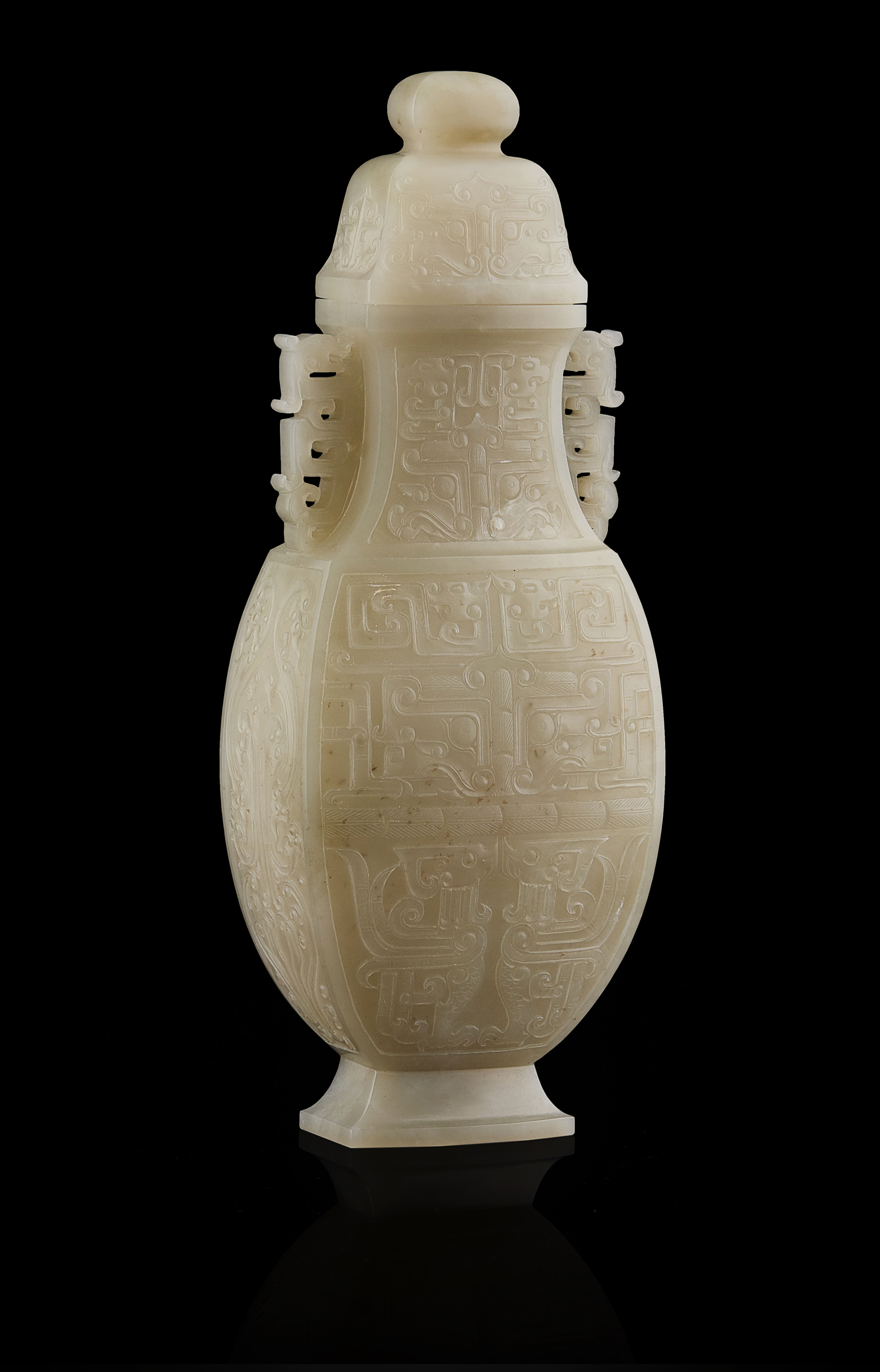 of baluster shape and with stylized dragon handles to the neck, the body carved in shallow relief with taotie masks between bands of kuilong dragons and birds, the cover carved with further taotie masks, the stone of an even pale tone