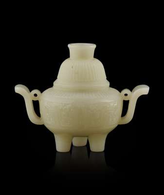 WHITE JADE CARVED TRIPOD CENSER AND COVER