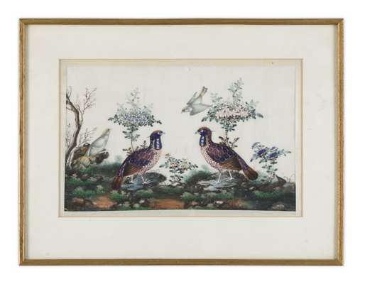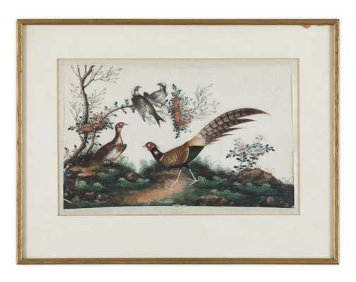 depicting different species of birds including pheasant, parrot and mandarin duck, some amongst rockwork, some perched upon branches, four in gilt frames, two in Hongmu frames (6)