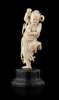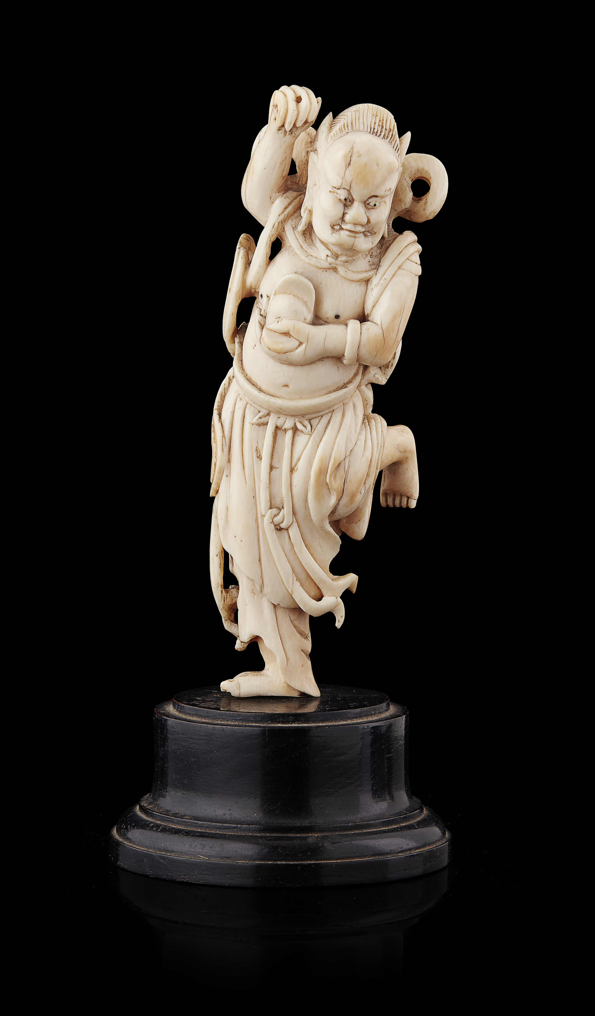 the figure carved with the body turned backwards and the left leg raised, the right hand held high and the left holding an ingot, the horned head with bushy hair, wearing loose pantaloons tied at the waist with a ribbon and the celestial scarf blowing in the wind, on wood stand