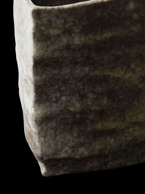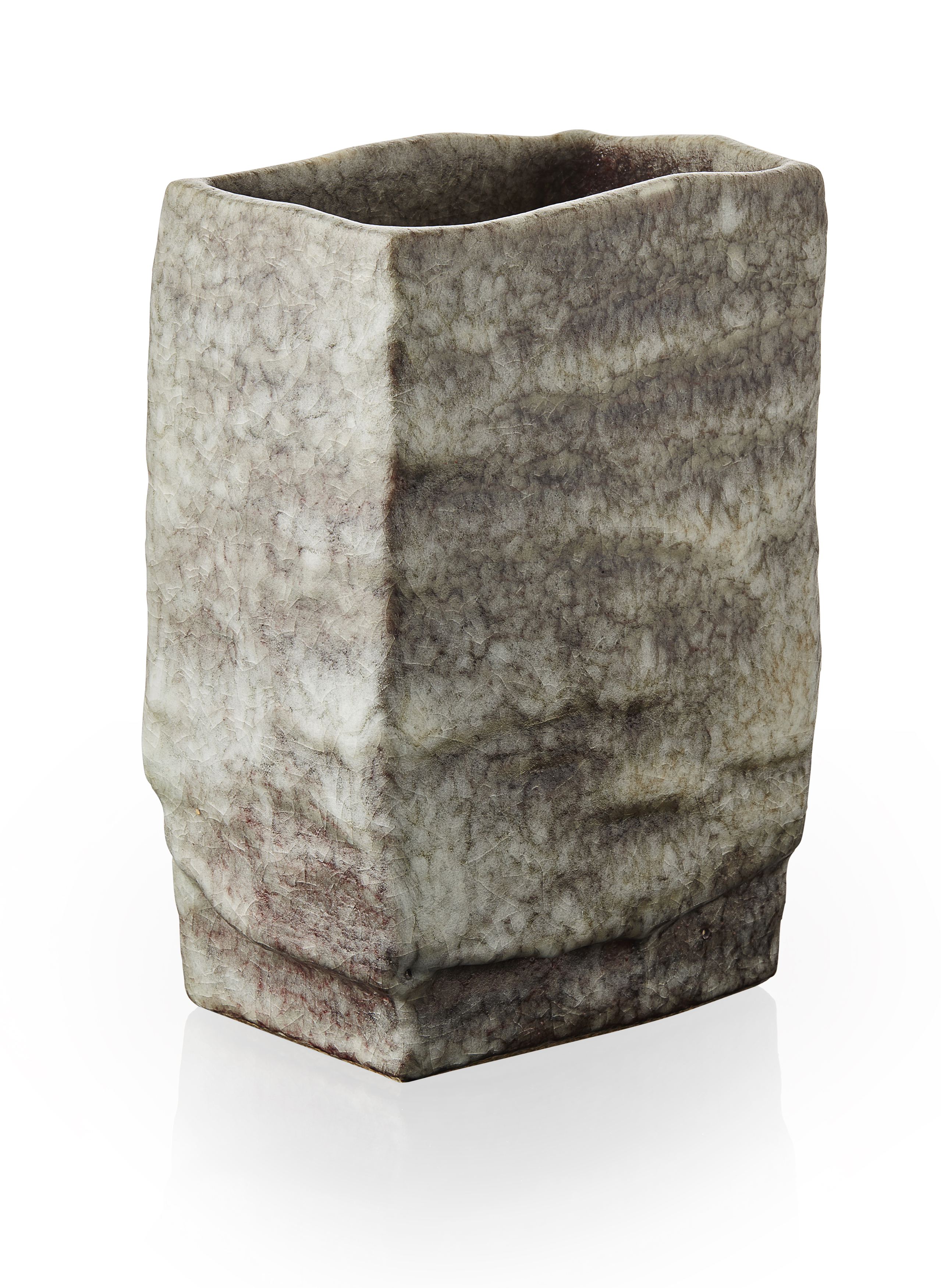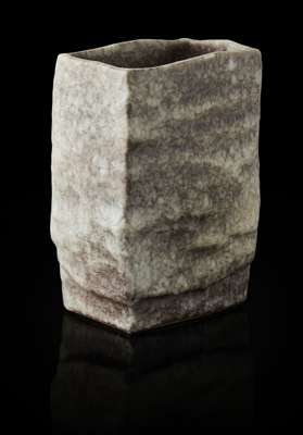 of cuboid shape and with irregular surface, covered with a thick feldspathic glaze stopping neatly at the base, signed on the base and with fitted wood box