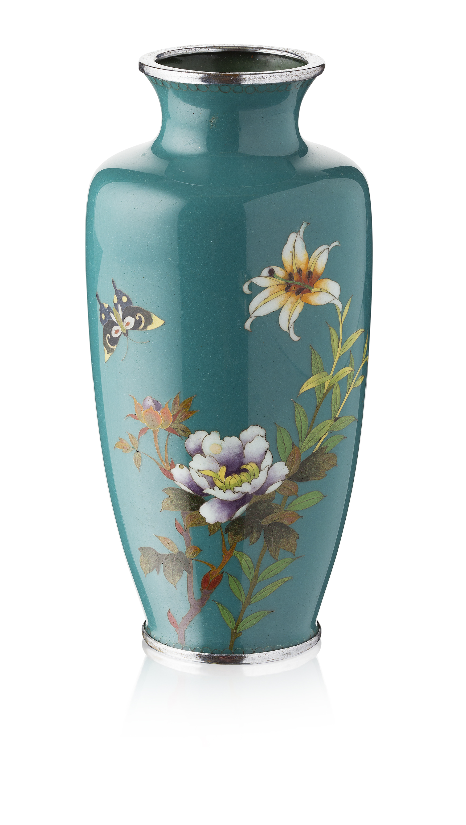 of baluster form, the turquoise body with a composition of lily, peony and butterfly