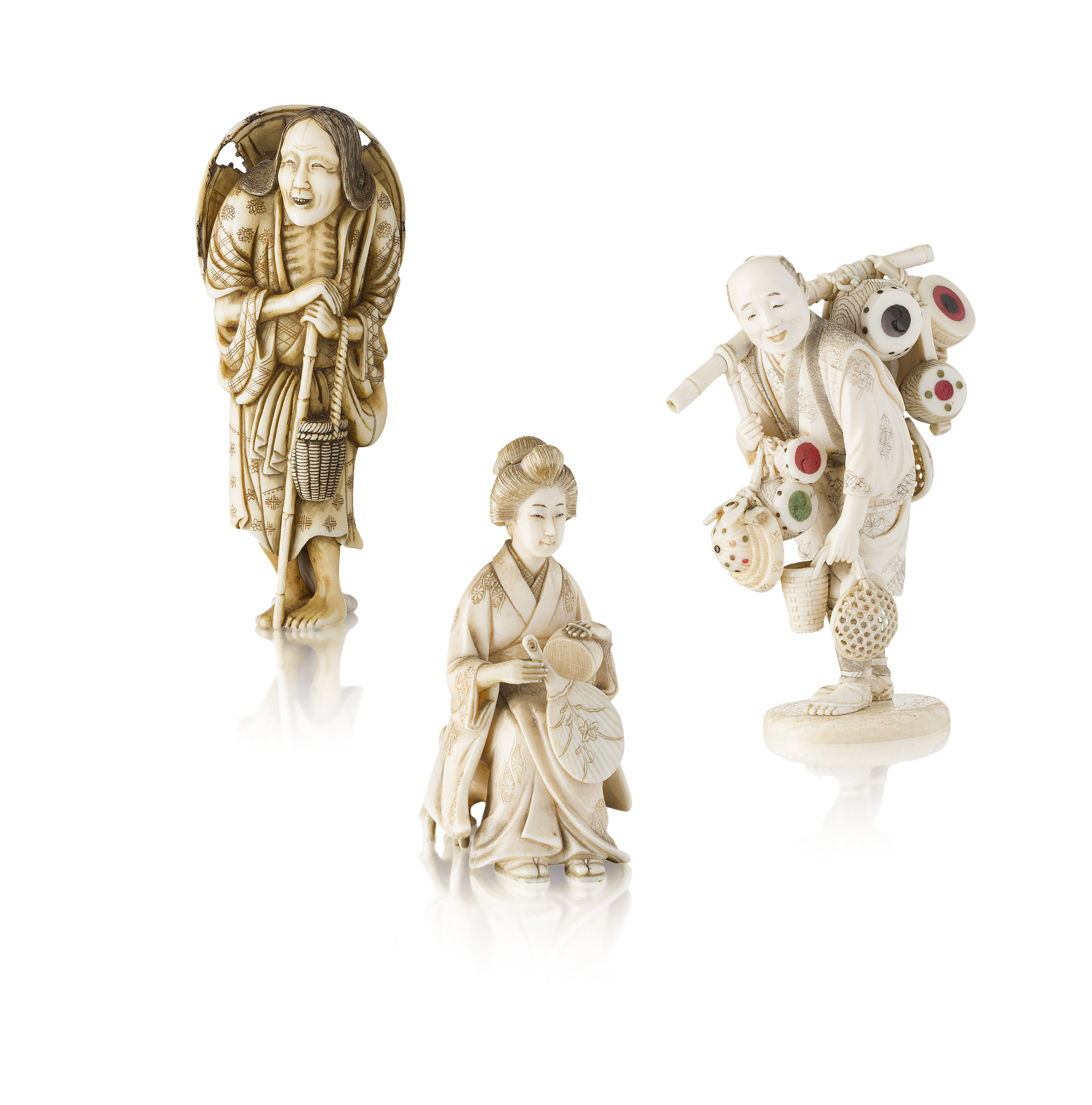 one okimono depicting a seated Geisha holding a fan, signed 'Masanobu' to the underside; one carved as a standing merchant of musical instruments, signed to the bottom; the netsuke portraying an elderly female peasant with a sugegasa (3)