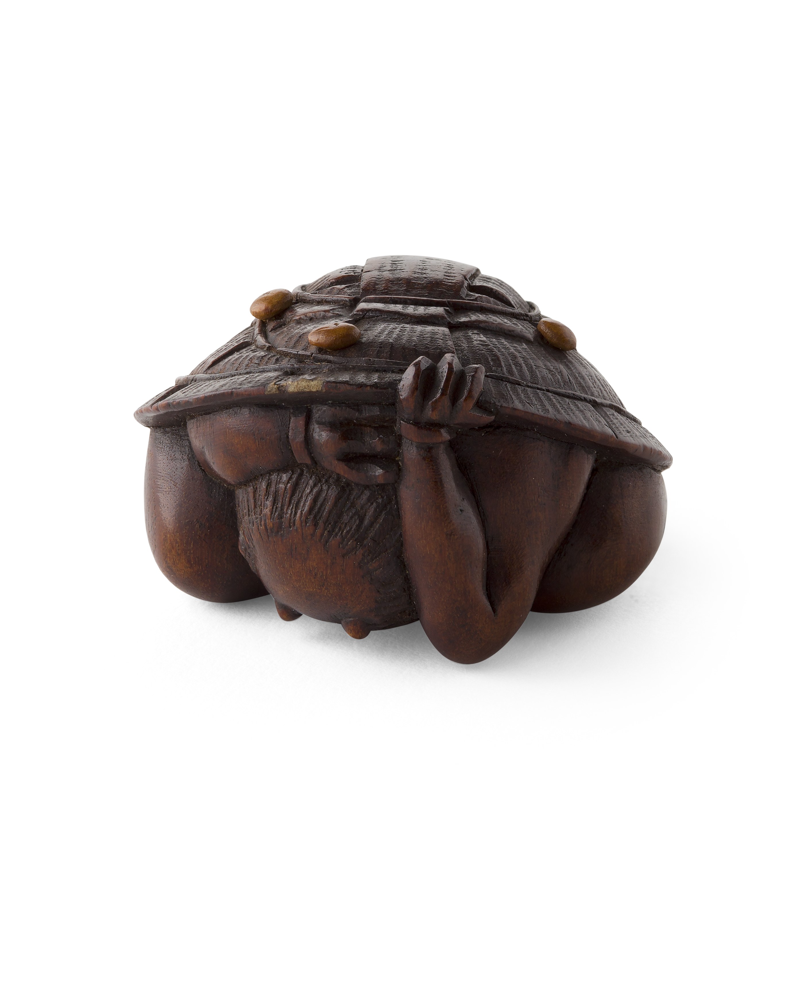 carved as an oni pulling a straw hat over his crouching body to hide, signed to the underside