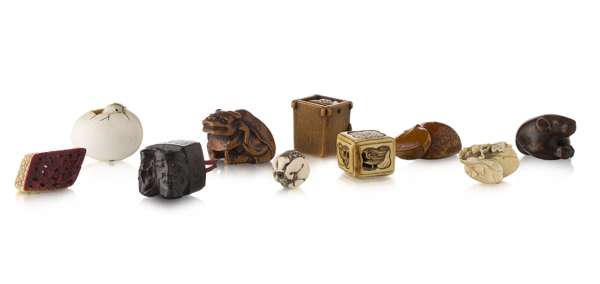a spherical shaped horse, signed 'Toho'; a wood carved rat, signed 'Masakazu', two conjoined chestnuts, signed 'Ryoshu'; a chick coming out of an egg, signed 'Kogyoku', a boy wearing the mask of a monster; two ivory carved conjoined gourds; a stag antler netsuke in the form of a hollow cube; a cube that opens to reveal three miniature figurines, signed 'Masamitsu'; a hornbill ivory carved netsuke with shagreen texture; a fishing bait box (10)