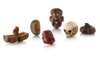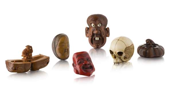 the first of corozo nut, study of Okame, signed 'Mazakazu'; the second a carved wood mask of Shikami with inset ivory eyes and teeth; the third a red-lacquered wood mask of a Hotei; the fourth carved as a nut opening in the middle to reveal a seated miniature lady, signed 'Ichiwa'; the fifth a pumpkin with a rat sitting on top; the sixth naturalistically carved in the form of a human skull, signd 'Teruyuki' (6)