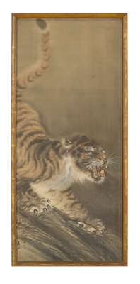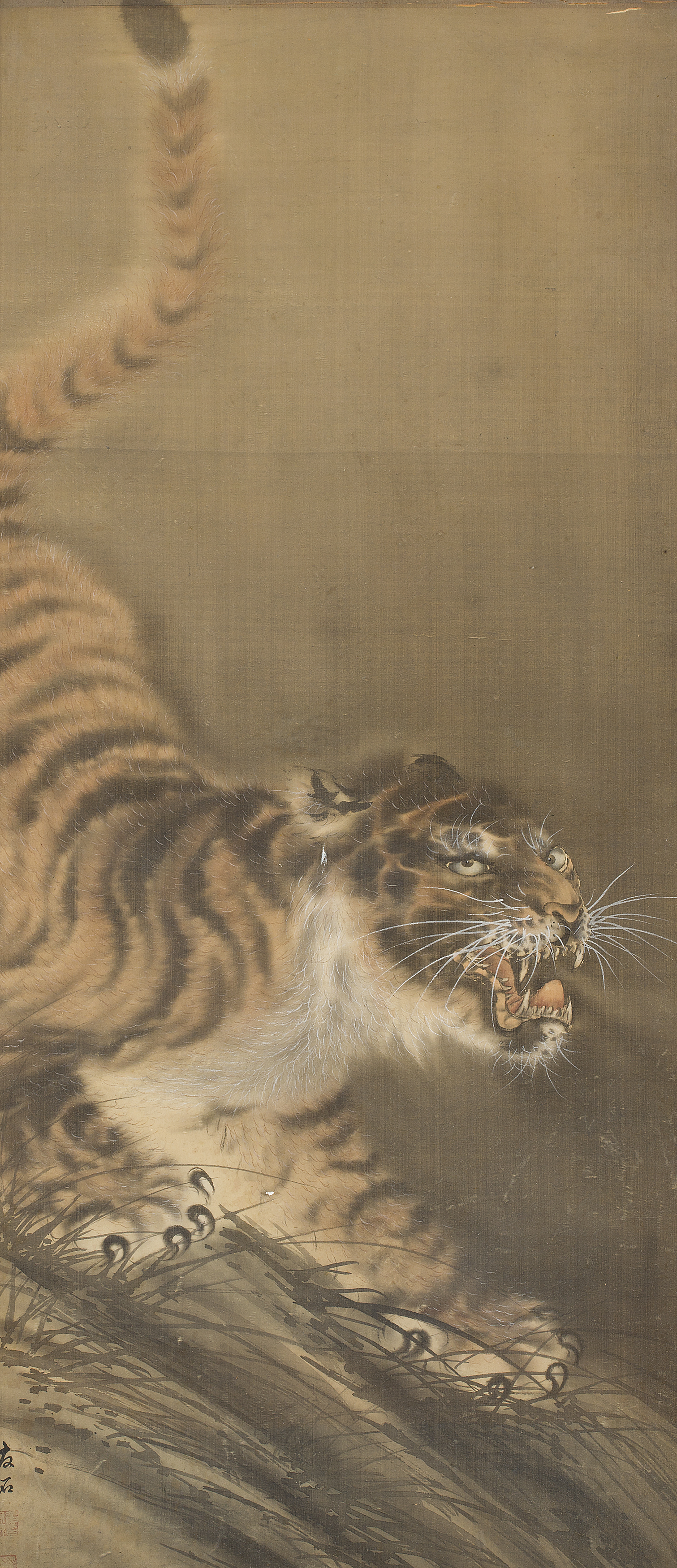 ink and colour on silk, depicting the animal with finely painted mane, his mouth open to roar, signed and with two seals