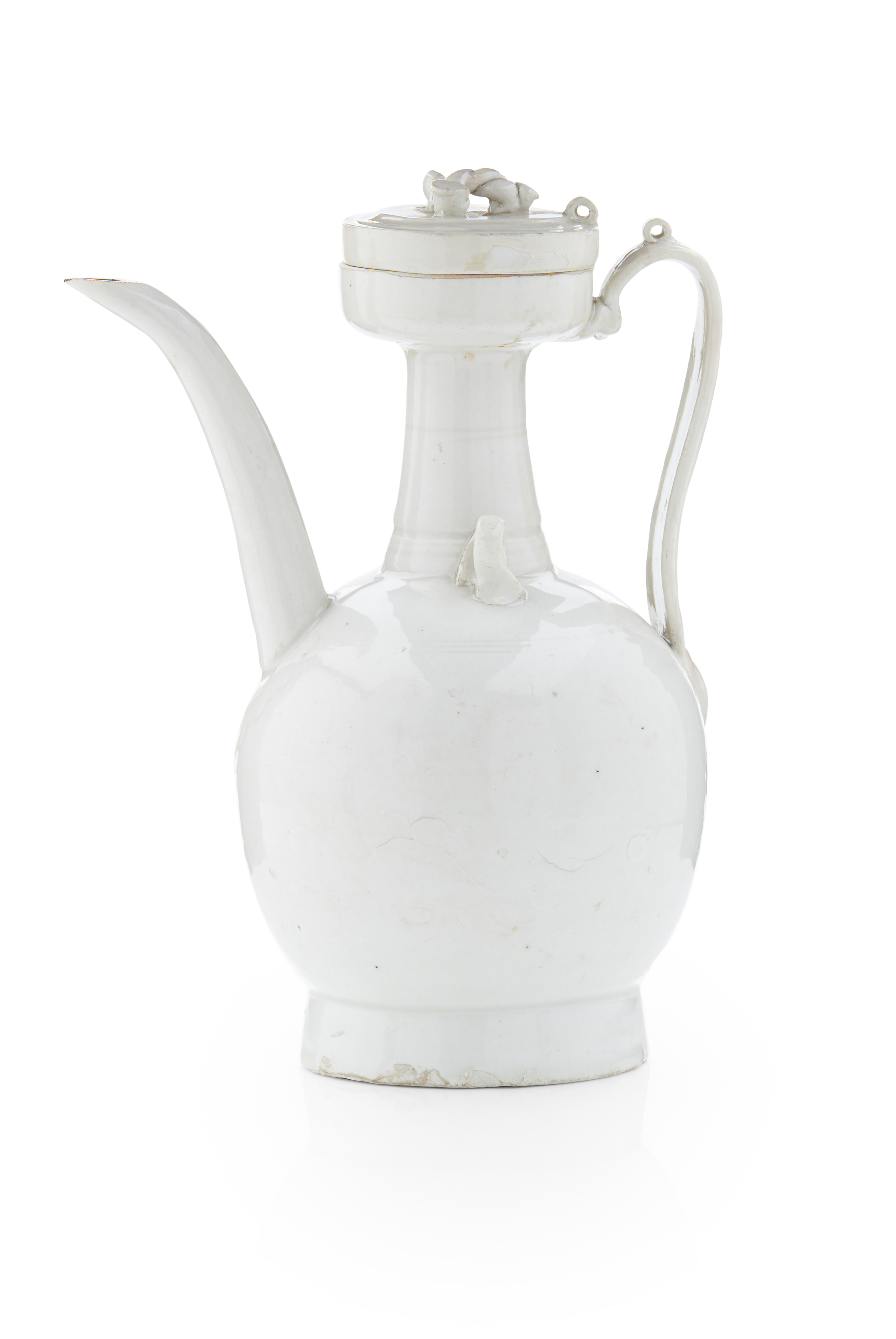 elegantly potted and covered in white glaze, the bulbous body with delicate elongated spout and flat handle, the thin neck supporting the large circular mouth, with knot decoration on the cover and stylised leaf pattern around the spout and handle